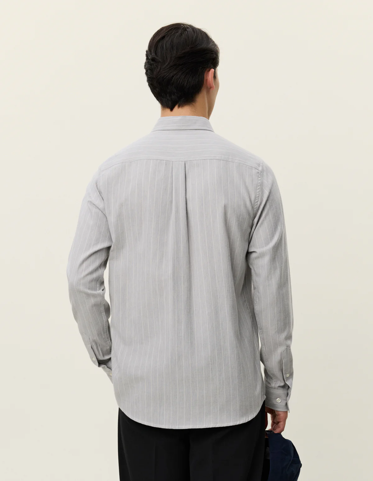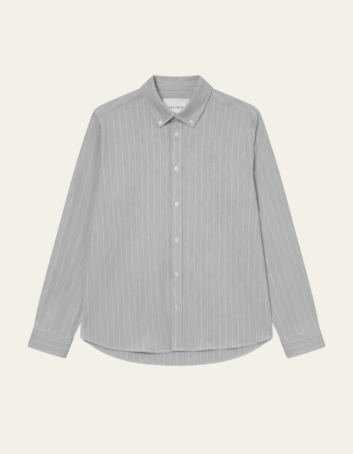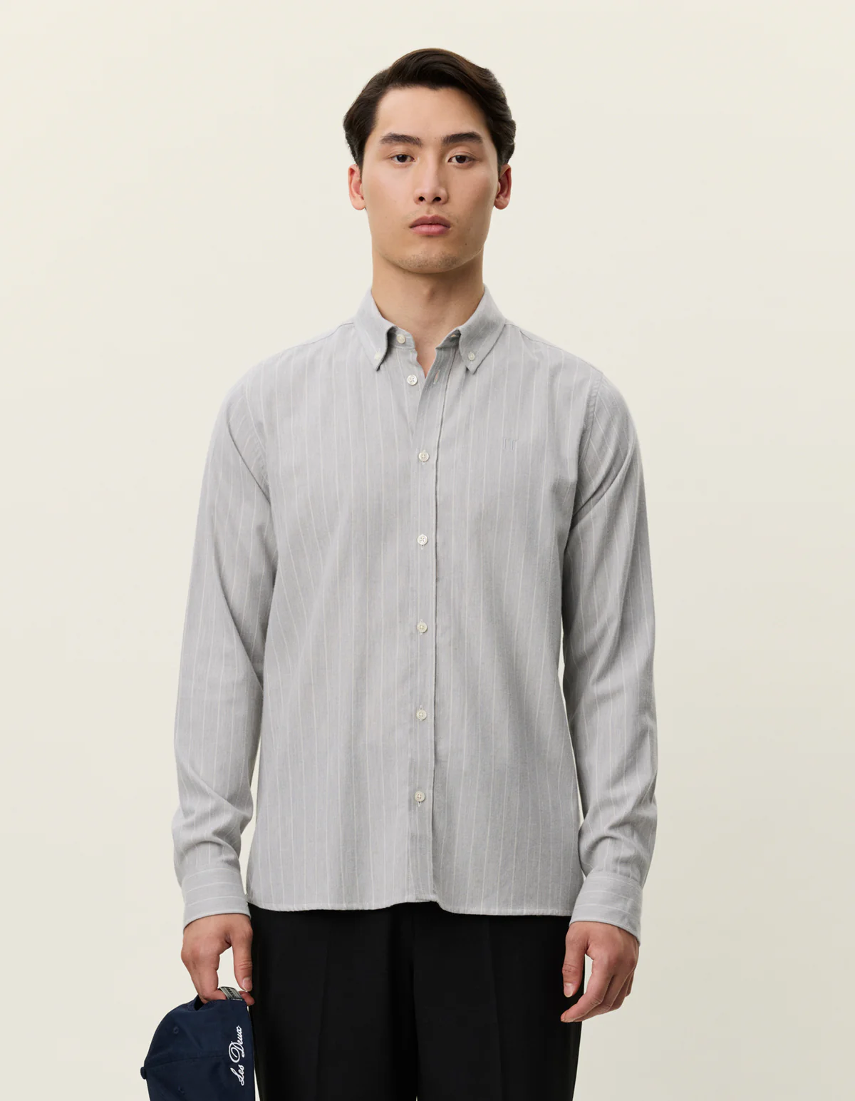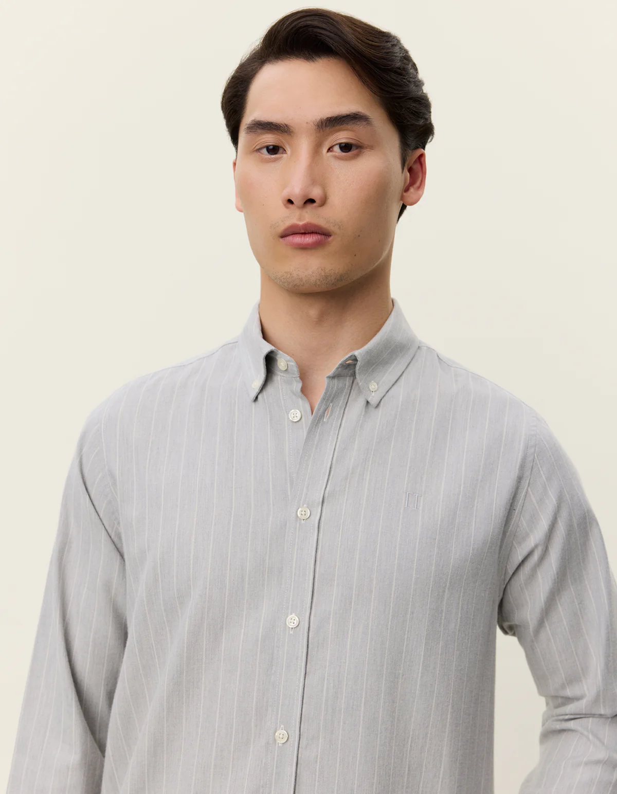 Les Deux Desert Reg Stripe Shirt En skjorta i regular fit av mjuk borstad bomull i melerat kritstrecksrandigt tyg, som ger både textur och subtil karaktär. Designad med button-down collar, hel knappslå, broderi på bröstet, rundad fåll och ok baktill för en ren finish.